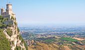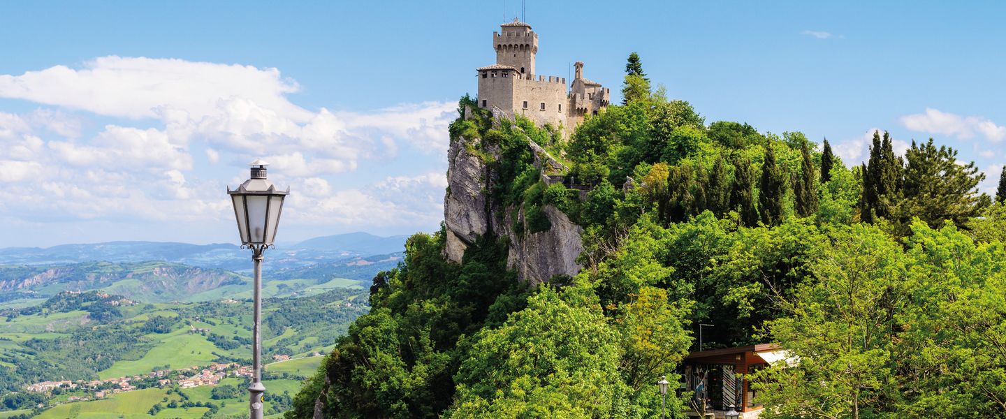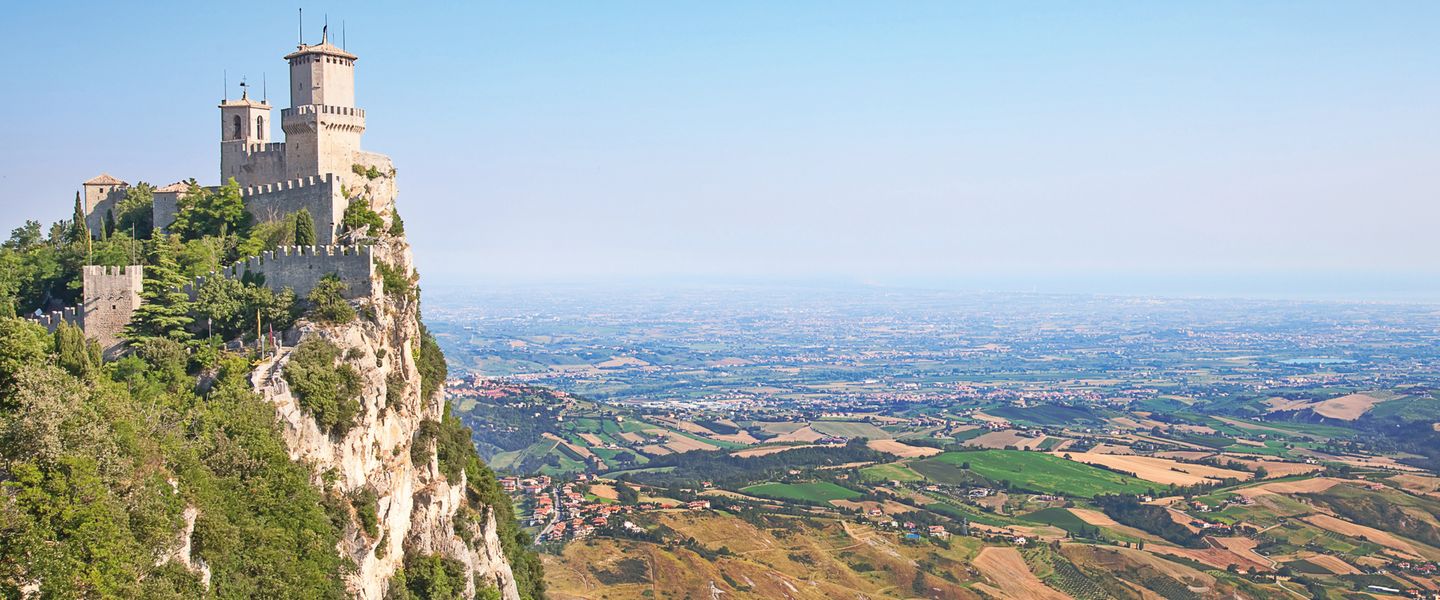 San Marino ist ein bergiger Kleinstaat im Norden Mittelitaliens. Er ist eine der ältesten Republiken der Welt und verfügt über viele historische Gebäude. An den Hängen des Monte Titano befindet sich die Hauptstadt San Marino. Sie ist für ihre von einer Mauer umgebene mittelalterliche Altstadt und ihre schmalen, kopfsteingepflasterten Straßen bekannt. Auf den benachbarten Gipfeln stehen 3 Wehrtürme aus dem 11. Jahrhundert.