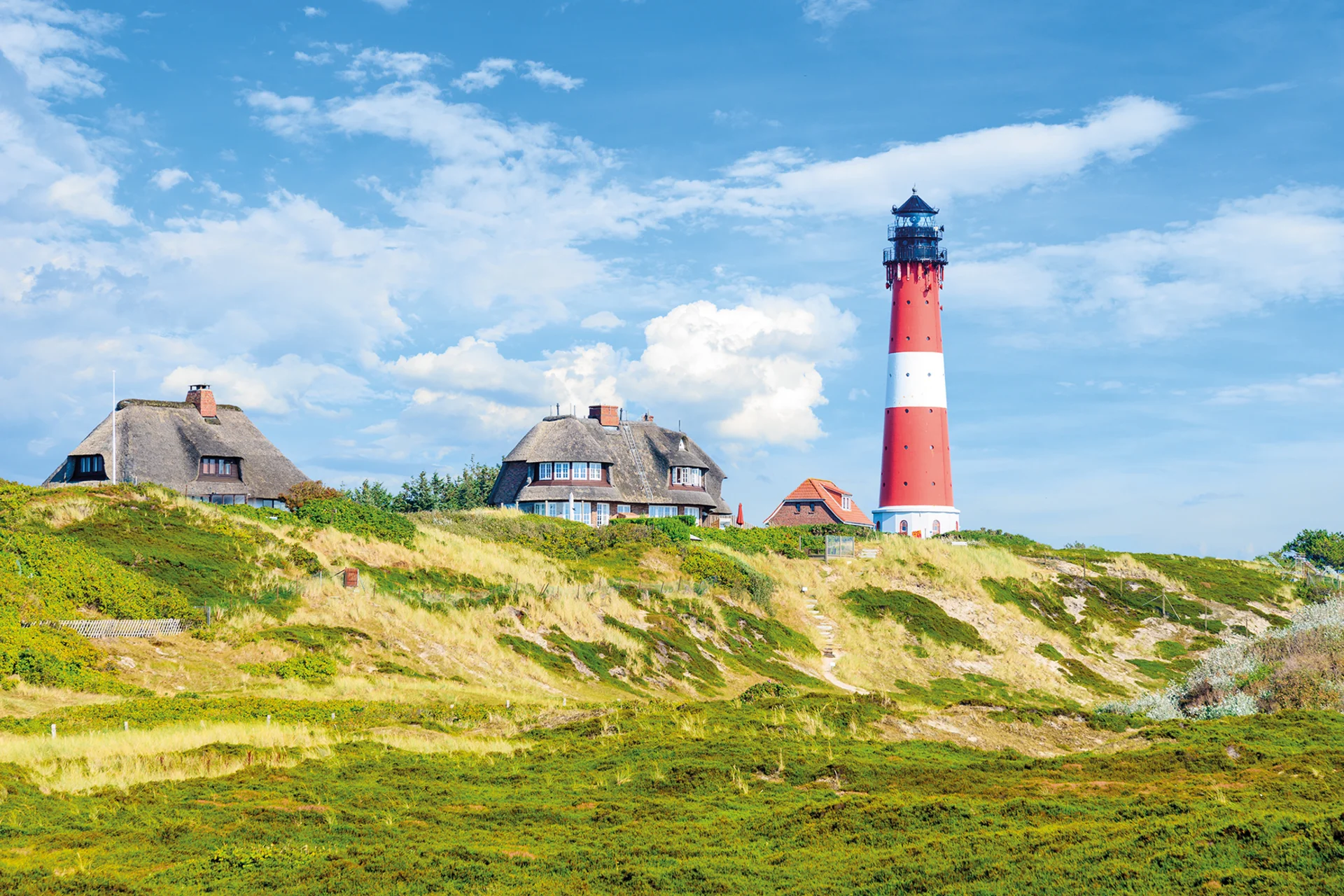 Heute bringt Sie der Bus über die dänische Grenze zur Insel Rømø. Von dort aus setzen Sie mit der Fähre in etwa einer Stunde über zum Hafen von List auf Sylt. An der nördlichen Landspitze starten Sie Ihre Radtour durch die beeindruckenden Dünen des Naturschutzgebiets. Entlang des Weges blühen die Sylt-Rosen, während Möwen, Regenpfeifer und Austernfischer Sie begleiten. Halten Sie Ausschau nach den vielen Schmetterlingsarten und vielleicht sogar nach Schweinswalen oder Robben. Vom Leuchtturm „Langer Christian“ beim „Roten Kliff“ genießen Sie einen herrlichen Blick über die Insel. Vorbei an Kampen, dem Ort der „Schönen und Reichen“, radeln Sie zum großen Seebad Westerland, wo Sie an Deutschlands berühmtester Fischbude „Gosch“ eine köstliche Mittagspause einlegen. Ihre Tour führt Sie weiter durch das Seevogelschutzgebiet Rantumer Becken und die einstige Hauptstadt Keitum, die mit ihren reetgedeckten Kapitänshäusern und liebevoll gepflegten Gärten als der idyllischste Ort auf Sylt gilt.